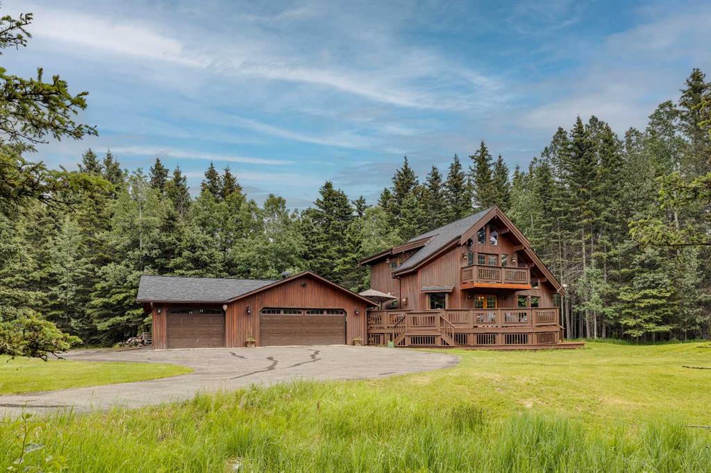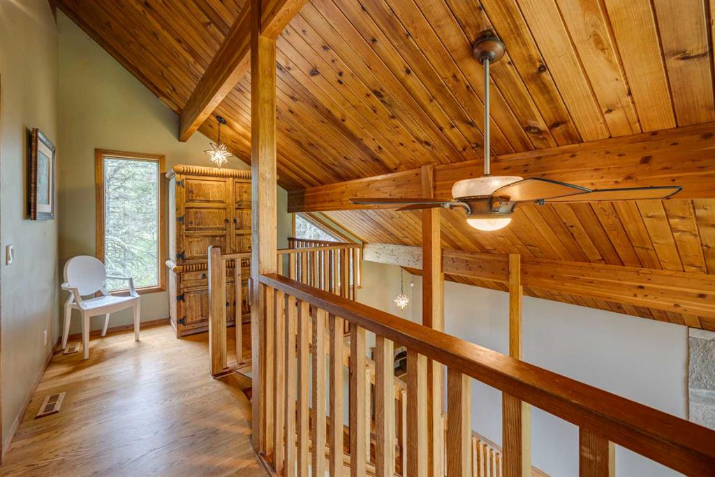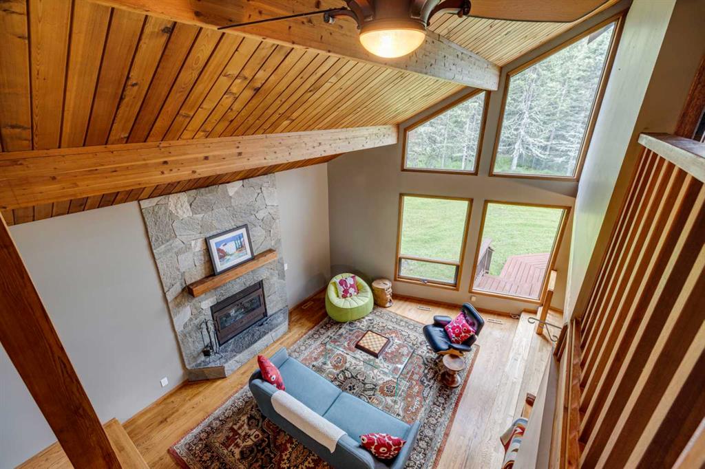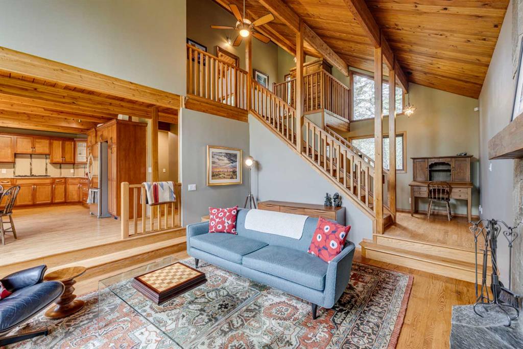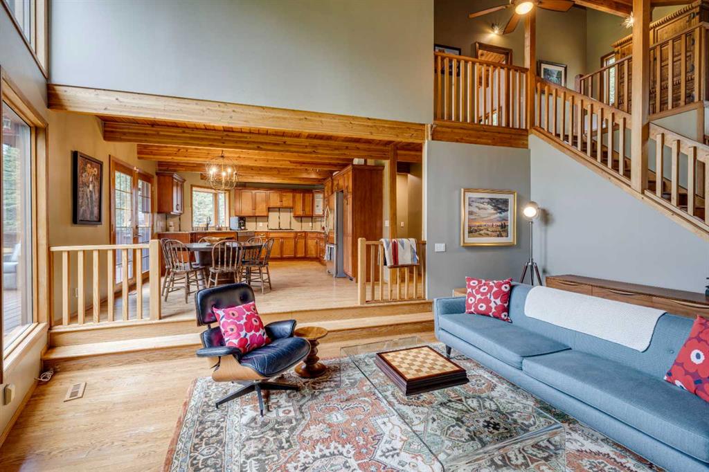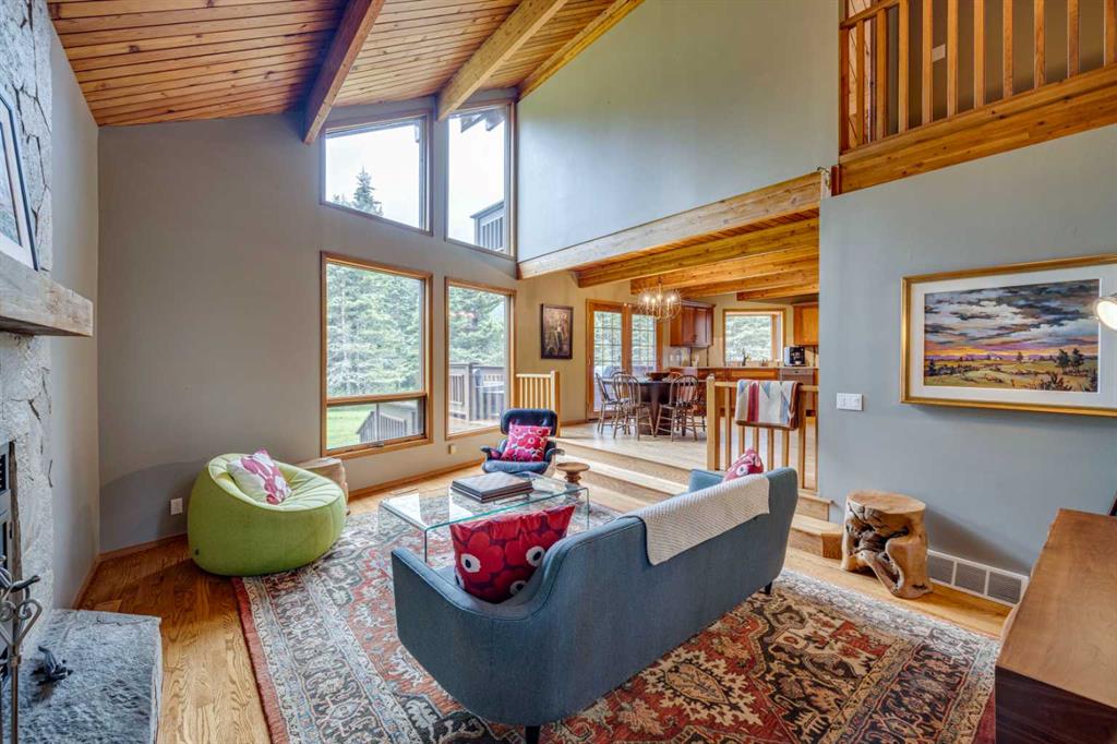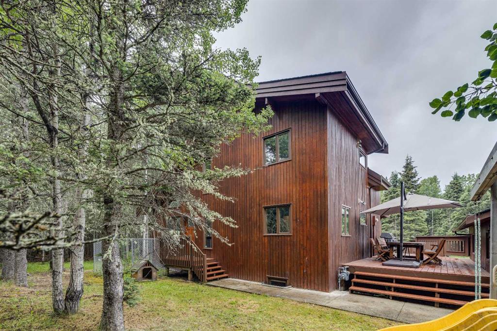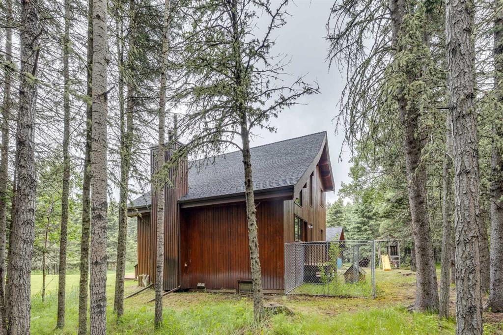 Tucked among the trees on a serene, S-shaped drive, this charming chalet-style home offers privacy, warmth, and an easy connection to nature, just minutes from the shops and cafes of Bragg Creek and an easy 25-minute drive to Calgary. With over 2,500 sq. ft. of living space, this home blends rustic character with thoughtful updates, designed for relaxed living and quiet inspiration. Step inside to a bright, reverse floor plan that makes the most of natural light and views. The open-concept main living area features vaulted, open-beam cedar ceilings and expansive windows framing the forest beyond. A stone-faced wood-burning fireplace anchors the space, perfect for cozy evenings after a day of exploring nearby trails. The kitchen offers both function and style with newer cabinetry, flooring, and a contemporary backsplash. French doors open to a large, sunny south-facing deck, an ideal outdoor living space for morning coffee, dining with friends, or simply breathing in the crisp mountain air. The main level includes a versatile bedroom or home office, a beautifully renovated full bathroom, and a convenient laundry room. Upstairs, the primary suite feels like a private retreat with its updated ensuite, walk-in closet, and a balcony overlooking treetops toward the Wintergreen ridge. A second bedroom with a half bath and an open loft area provide flexible space for guests, hobbies, or relaxation. The fully developed lower level offers a cozy family room with a gas fireplace, a spacious fourth bedroom currently set up as a craft room, another full bathroom, and ample storage. The oversized garage includes a third bay addition with a full subpanel and 220/50 amp wiring, ready for an EV, workshop, or hot tub, with an additional pad behind. Here, you can live close to nature while staying connected to everything you need. Enjoy golf at Wintergreen, endless recreation on the West Bragg Creek trail network, or adventures in Kananaskis, all just beyond your doorstep.