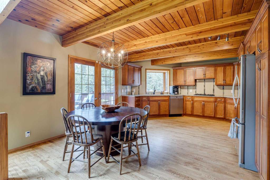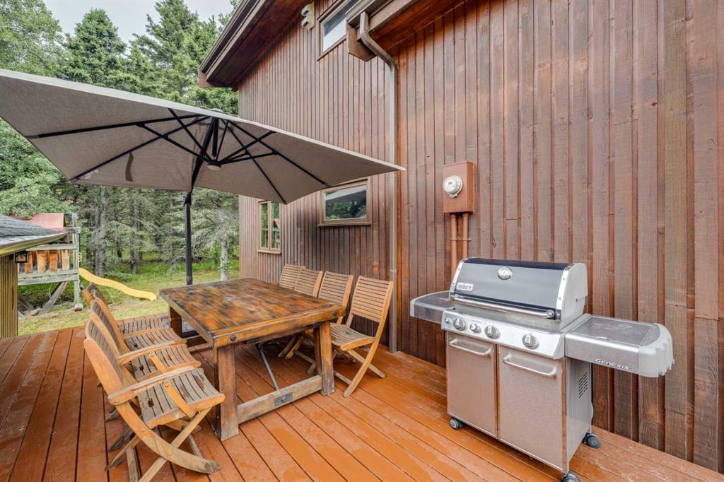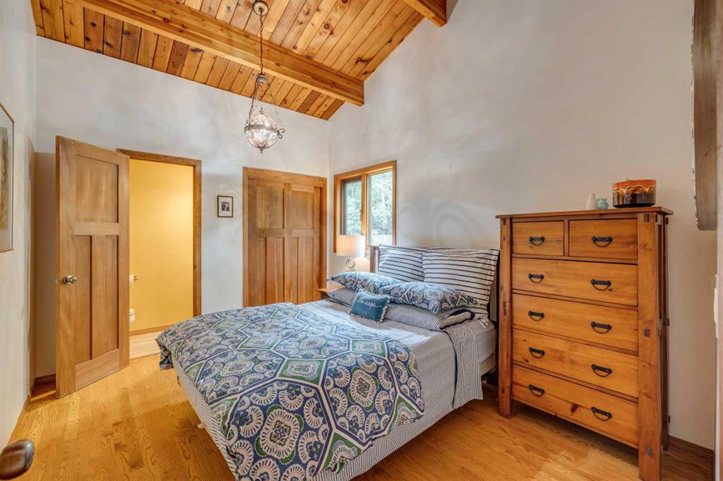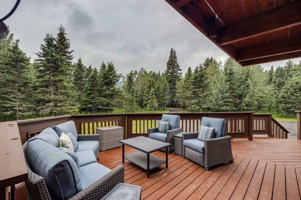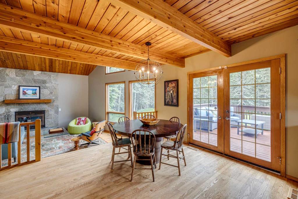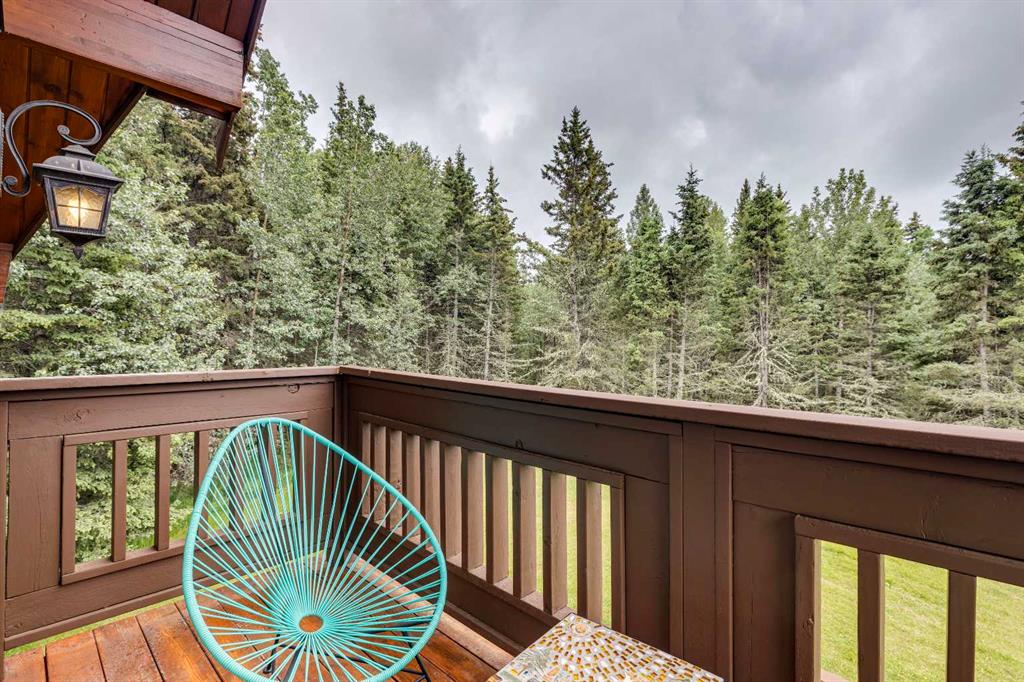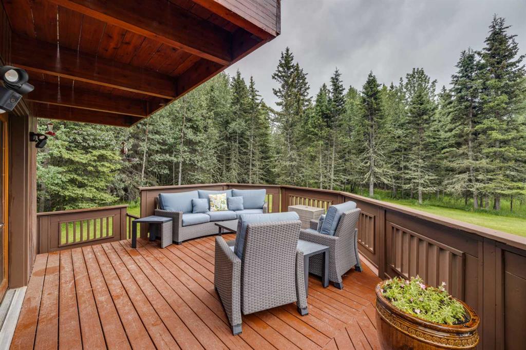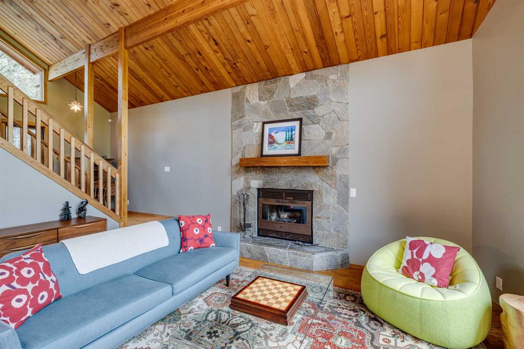 Tucked among the trees on a serene, S-shaped drive, this charming chalet-style home offers privacy, warmth, and an easy connection to nature, just minutes from the shops and cafes of Bragg Creek and an easy 25-minute drive to Calgary. With over 2,500 sq. ft. of living space, this home blends rustic character with thoughtful updates, designed for relaxed living and quiet inspiration. Step inside to a bright, reverse floor plan that makes the most of natural light and views. The open-concept main living area features vaulted, open-beam cedar ceilings and expansive windows framing the forest beyond. A stone-faced wood-burning fireplace anchors the space, perfect for cozy evenings after a day of exploring nearby trails. The kitchen offers both function and style with newer cabinetry, flooring, and a contemporary backsplash. French doors open to a large, sunny south-facing deck, an ideal outdoor living space for morning coffee, dining with friends, or simply breathing in the crisp mountain air. The main level includes a versatile bedroom or home office, a beautifully renovated full bathroom, and a convenient laundry room. Upstairs, the primary suite feels like a private retreat with its updated ensuite, walk-in closet, and a balcony overlooking treetops toward the Wintergreen ridge. A second bedroom with a half bath and an open loft area provide flexible space for guests, hobbies, or relaxation. The fully developed lower level offers a cozy family room with a gas fireplace, a spacious fourth bedroom currently set up as a craft room, another full bathroom, and ample storage. The oversized garage includes a third bay addition with a full subpanel and 220/50 amp wiring, ready for an EV, workshop, or hot tub, with an additional pad behind. Here, you can live close to nature while staying connected to everything you need. Enjoy golf at Wintergreen, endless recreation on the West Bragg Creek trail network, or adventures in Kananaskis, all just beyond your doorstep.