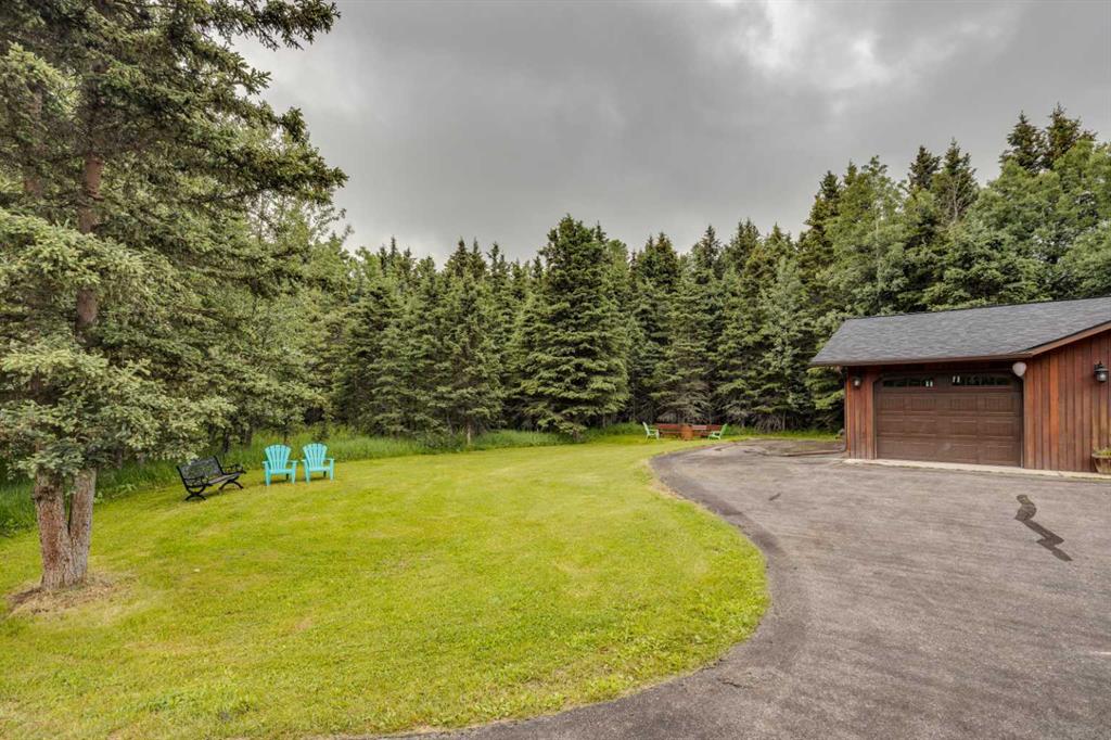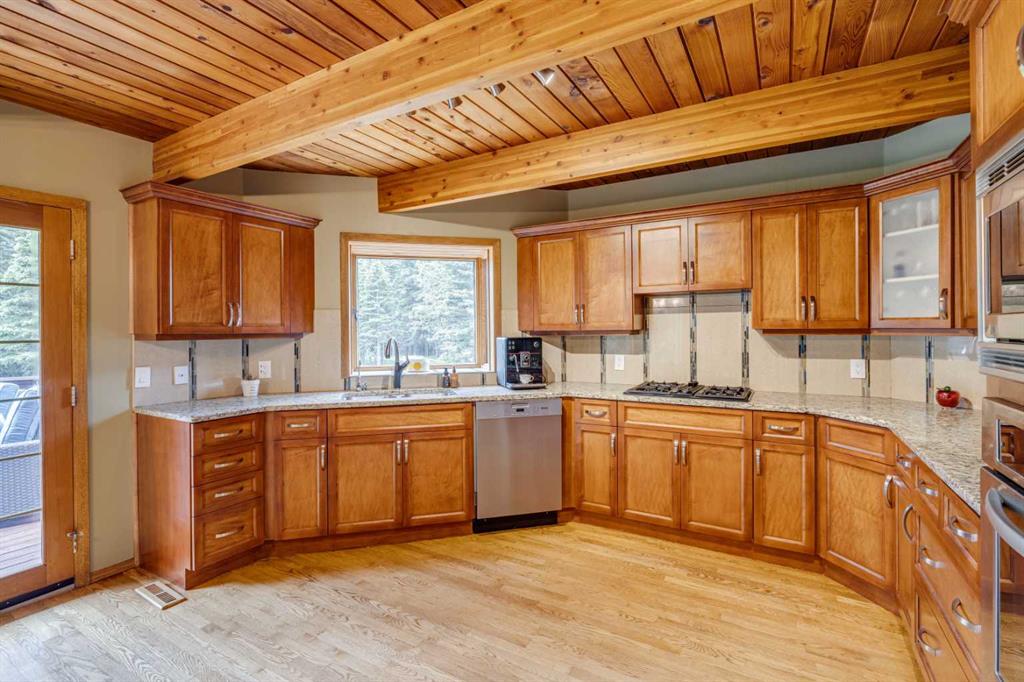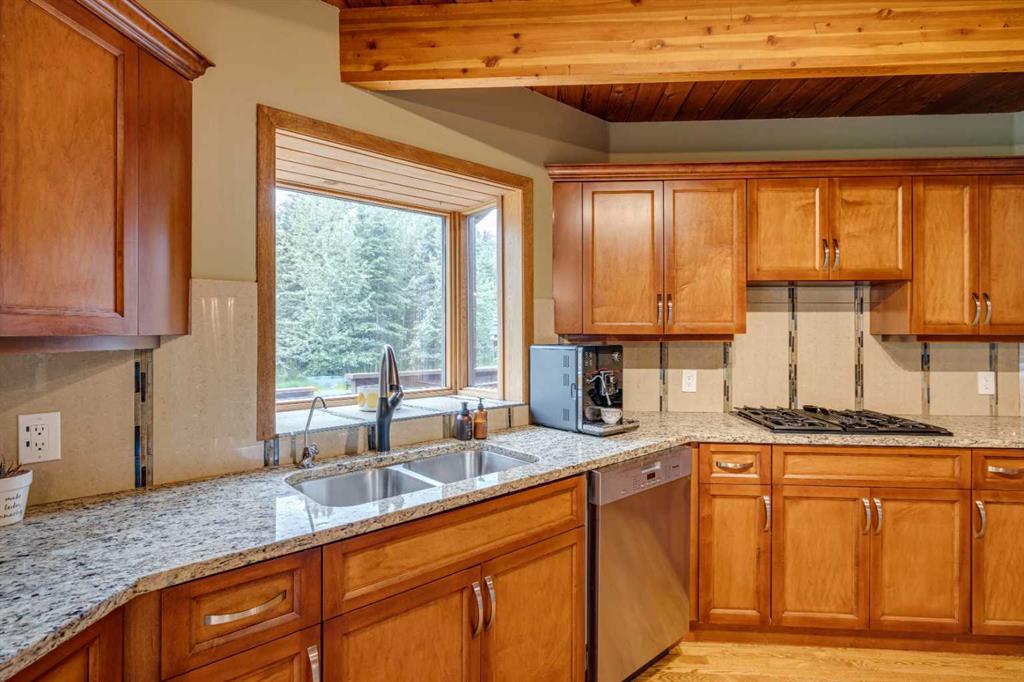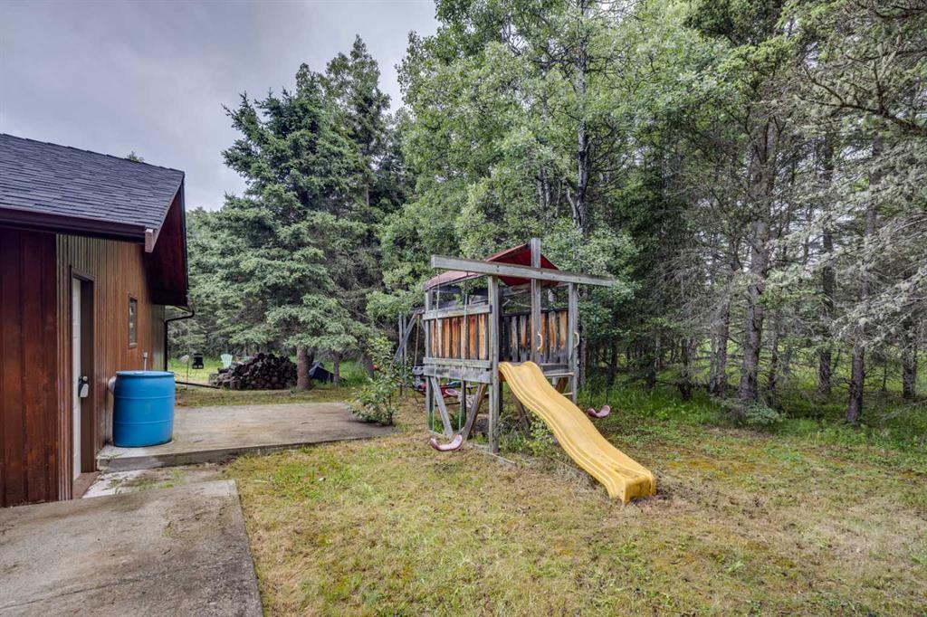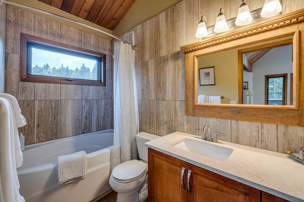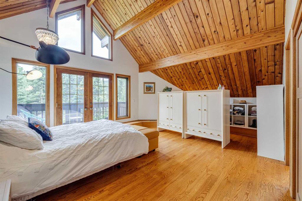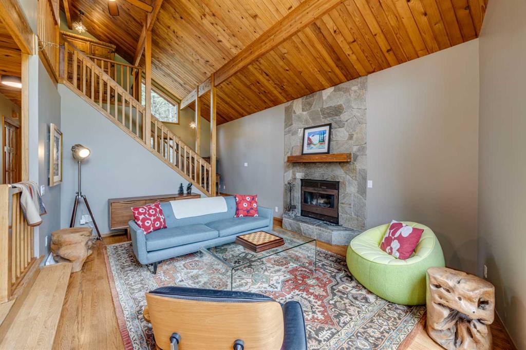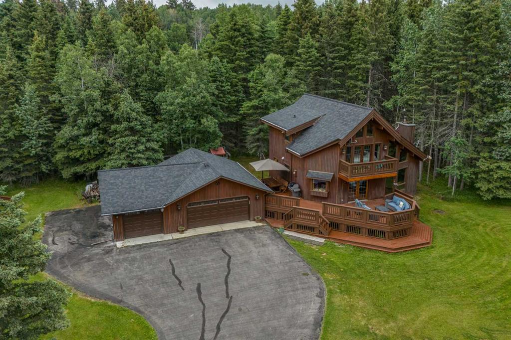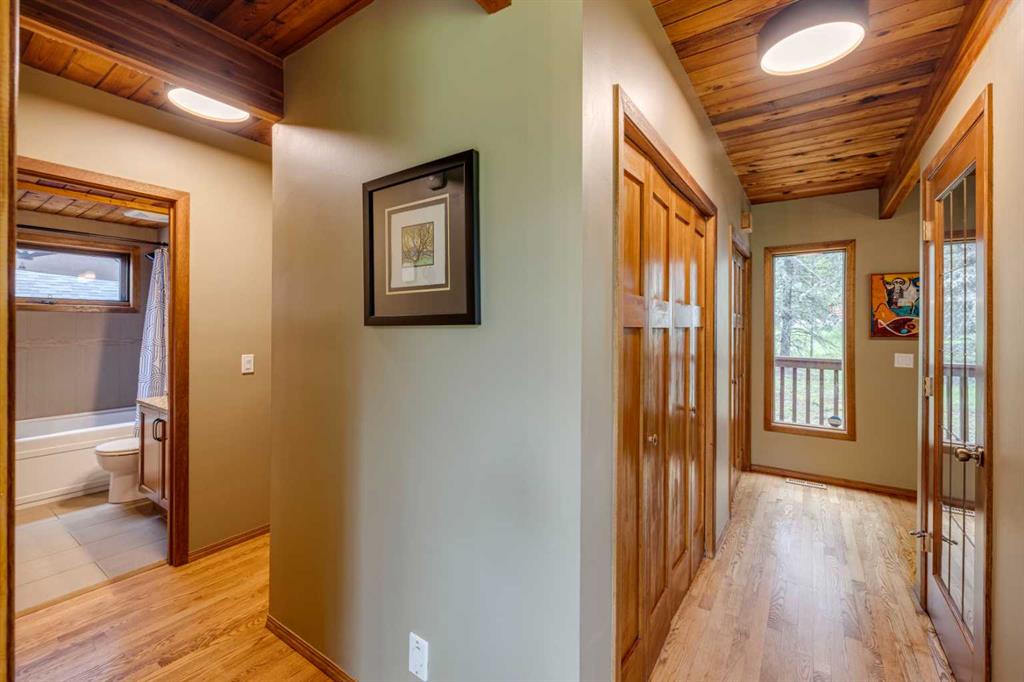 Tucked among the trees on a serene, S-shaped drive, this charming chalet-style home offers privacy, warmth, and an easy connection to nature, just minutes from the shops and cafes of Bragg Creek and an easy 25-minute drive to Calgary. With over 2,500 sq. ft. of living space, this home blends rustic character with thoughtful updates, designed for relaxed living and quiet inspiration. Step inside to a bright, reverse floor plan that makes the most of natural light and views. The open-concept main living area features vaulted, open-beam cedar ceilings and expansive windows framing the forest beyond. A stone-faced wood-burning fireplace anchors the space, perfect for cozy evenings after a day of exploring nearby trails. The kitchen offers both function and style with newer cabinetry, flooring, and a contemporary backsplash. French doors open to a large, sunny south-facing deck, an ideal outdoor living space for morning coffee, dining with friends, or simply breathing in the crisp mountain air. The main level includes a versatile bedroom or home office, a beautifully renovated full bathroom, and a convenient laundry room. Upstairs, the primary suite feels like a private retreat with its updated ensuite, walk-in closet, and a balcony overlooking treetops toward the Wintergreen ridge. A second bedroom with a half bath and an open loft area provide flexible space for guests, hobbies, or relaxation. The fully developed lower level offers a cozy family room with a gas fireplace, a spacious fourth bedroom currently set up as a craft room, another full bathroom, and ample storage. The oversized garage includes a third bay addition with a full subpanel and 220/50 amp wiring, ready for an EV, workshop, or hot tub, with an additional pad behind. Here, you can live close to nature while staying connected to everything you need. Enjoy golf at Wintergreen, endless recreation on the West Bragg Creek trail network, or adventures in Kananaskis, all just beyond your doorstep.