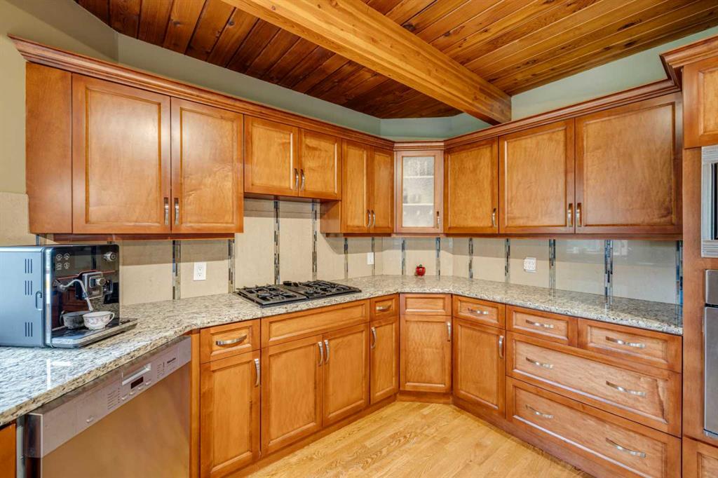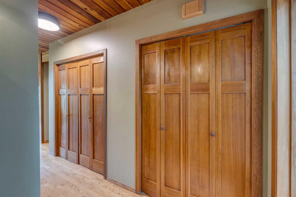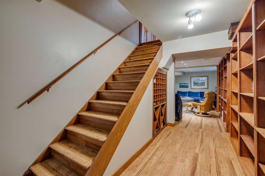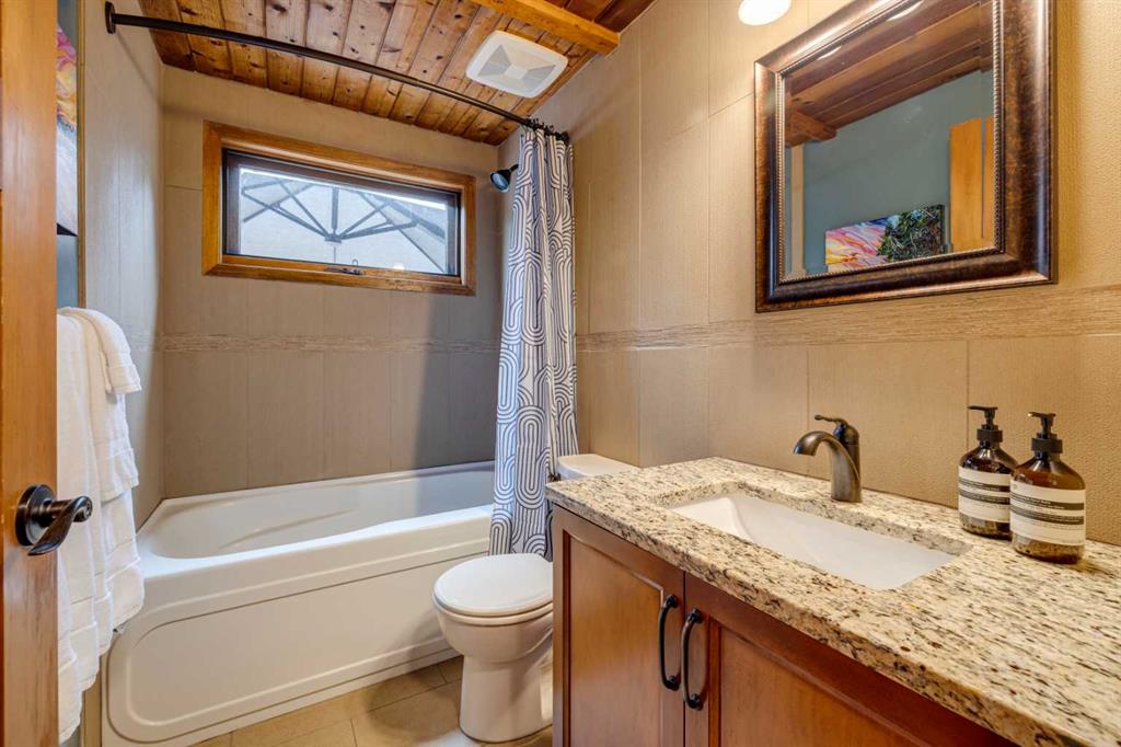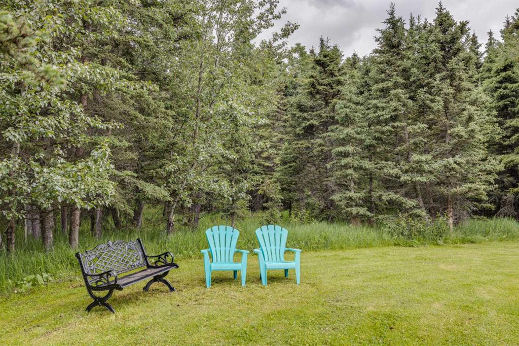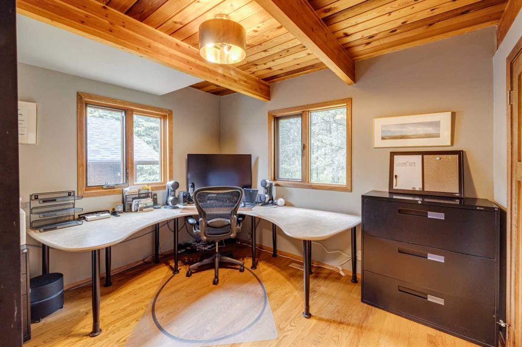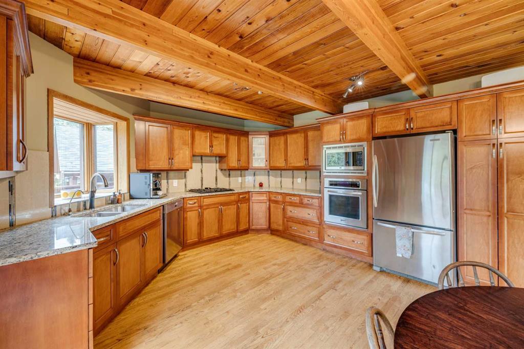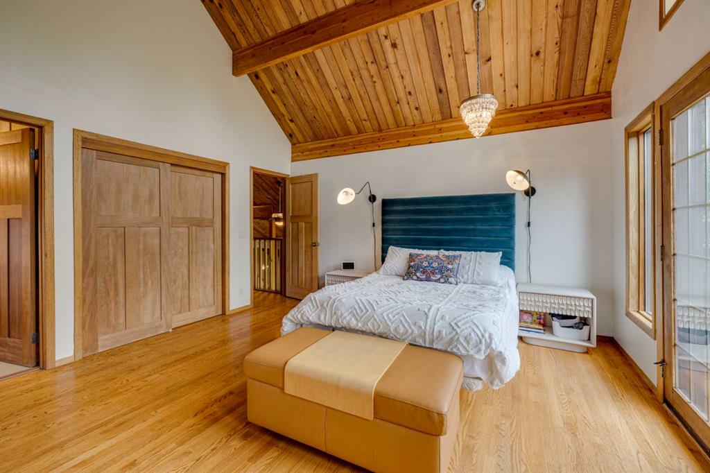 Tucked among the trees on a serene, S-shaped drive, this charming chalet-style home offers privacy, warmth, and an easy connection to nature, just minutes from the shops and cafes of Bragg Creek and an easy 25-minute drive to Calgary. With over 2,500 sq. ft. of living space, this home blends rustic character with thoughtful updates, designed for relaxed living and quiet inspiration. Step inside to a bright, reverse floor plan that makes the most of natural light and views. The open-concept main living area features vaulted, open-beam cedar ceilings and expansive windows framing the forest beyond. A stone-faced wood-burning fireplace anchors the space, perfect for cozy evenings after a day of exploring nearby trails. The kitchen offers both function and style with newer cabinetry, flooring, and a contemporary backsplash. French doors open to a large, sunny south-facing deck, an ideal outdoor living space for morning coffee, dining with friends, or simply breathing in the crisp mountain air. The main level includes a versatile bedroom or home office, a beautifully renovated full bathroom, and a convenient laundry room. Upstairs, the primary suite feels like a private retreat with its updated ensuite, walk-in closet, and a balcony overlooking treetops toward the Wintergreen ridge. A second bedroom with a half bath and an open loft area provide flexible space for guests, hobbies, or relaxation. The fully developed lower level offers a cozy family room with a gas fireplace, a spacious fourth bedroom currently set up as a craft room, another full bathroom, and ample storage. The oversized garage includes a third bay addition with a full subpanel and 220/50 amp wiring, ready for an EV, workshop, or hot tub, with an additional pad behind. Here, you can live close to nature while staying connected to everything you need. Enjoy golf at Wintergreen, endless recreation on the West Bragg Creek trail network, or adventures in Kananaskis, all just beyond your doorstep.