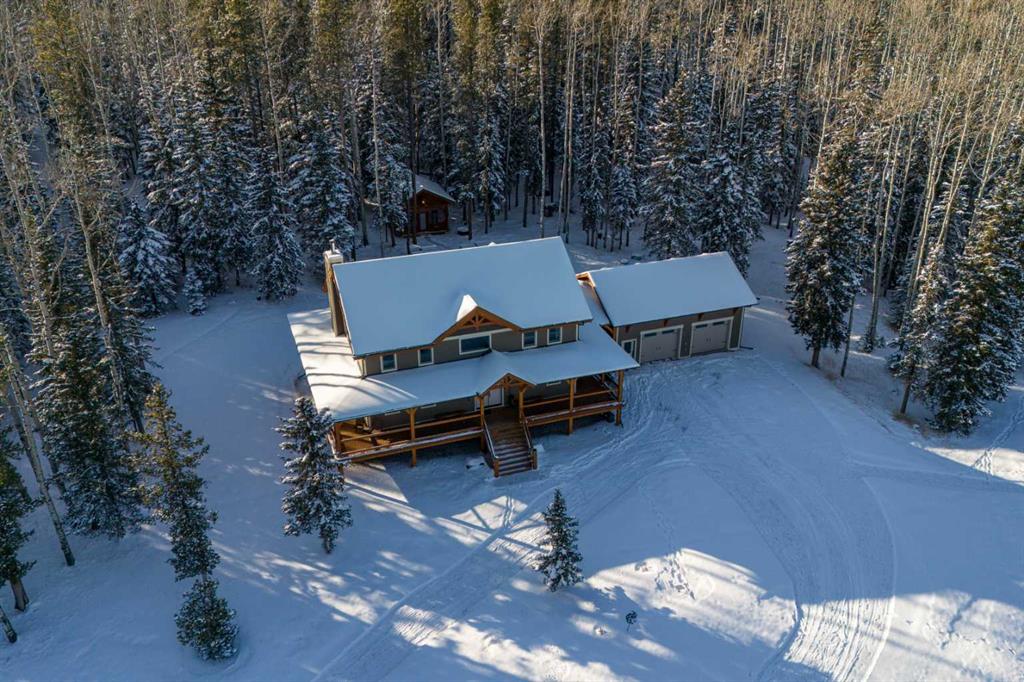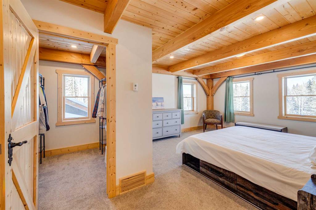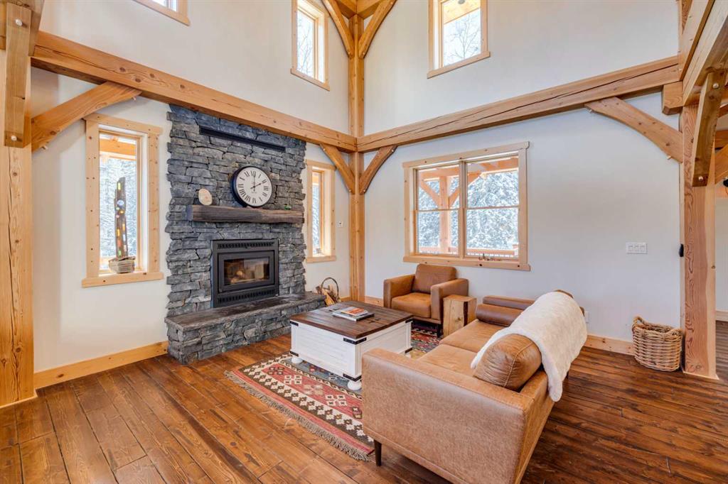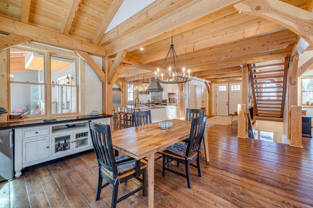 BRAGG CREEK TIMBER FRAME HOME ON 9.71 ACRES WITH CREEK & POND! This custom 2019 full structural timber frame home in West Bragg Creek offers over 4,000 sq ft of exceptional craftsmanship and a lifestyle immersed in nature. Set on a private acreage with a year-round creek, pond, and Trans Canada Trail access at the end of the driveway connecting you directly to world-class Kananaskis Country, this property is the ultimate retreat for outdoor enthusiasts and families seeking space, serenity, and adventure. Home Highlights: Hand-sculpted, pegged DOUGLAS FIR BEAMS AND COLUMNS, soaring vaulted ceilings, and walls of windows that frame panoramic views and flood the home with natural light. Custom pine hardwood flooring and an open-tread staircase carry the craftsmanship throughout every level. Open concept great room with stone wood-burning fireplace, perfect for cozy winter nights after skiing or snowshoeing. Chef’s kitchen with granite counters, central island, gas cooktop, and oversized side-by-side fridge/freezer designed for entertaining, holiday gatherings, and farm-to-table meals from your own greenhouse. Main floor bedroom/flex room provides ideal accommodations for guests, a home office, or multigenerational living, paired with laundry, mud room, and 2-piece bath for complete main-level functionality. Up the custom open-tread staircase, a very private primary retreat with luxurious 5-piece ensuite, jetted tub, tile shower, and double vanity, plus den/flex space as the perfect adult getaway. The loft overlooking the den and great room below delivers a magical, open-air feel that can be whatever you envision. Fully developed lower level with large family and games areas, three additional bright bedrooms, and flexible 2-piece and 3-piece bathrooms, ideal for movie nights, teens’ hangouts, or guest accommodations. In-floor heating on all 3 levels and garage. 12″ ICE foundation and roof (R60 insulating value) for exceptional efficiency and year-round comfort. Tankless hot water system. Wrap-around covered deck for year-round outdoor living, from summer barbecues to watching wildlife wander through the property. Property Features: 9.71 acres with creek, pond, and endless room to explore. Fully fenced and cross-fenced, ideal for horses and pets. Deluxe treehouse, firepit area, and miles of trails connecting directly to the natural beauty of Kananaskis Country via Trans Canada Trail at the end of the driveway. 200 sq ft powered GREENHOUSE with water supply supporting sustainable living and year-round growing. Abundant, high-quality well water and high-end septic mound system. Oversized heated double garage with 12′ ceilings and 60-amp sub-panel, ready for a workshop, EV charging, or all your recreational gear. Minutes to Bragg Creek amenities and world-class Kananaskis Country recreation, with three convenient highway routes to Calgary. A rare opportunity to own a modern timber frame home in one of Alberta’s most sought-after lifestyle communities.