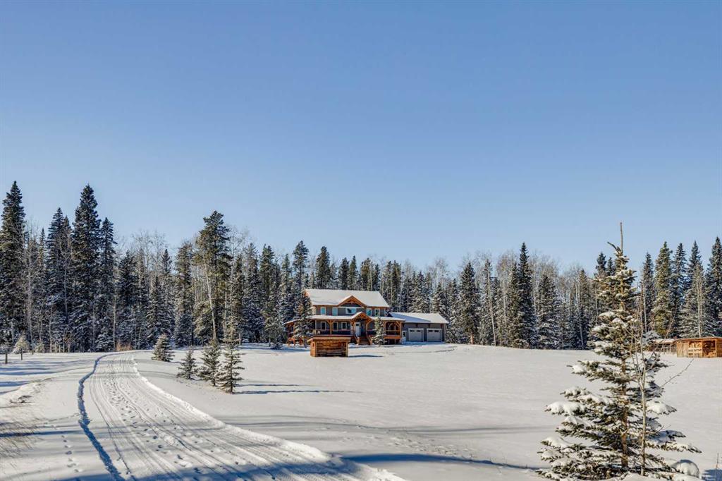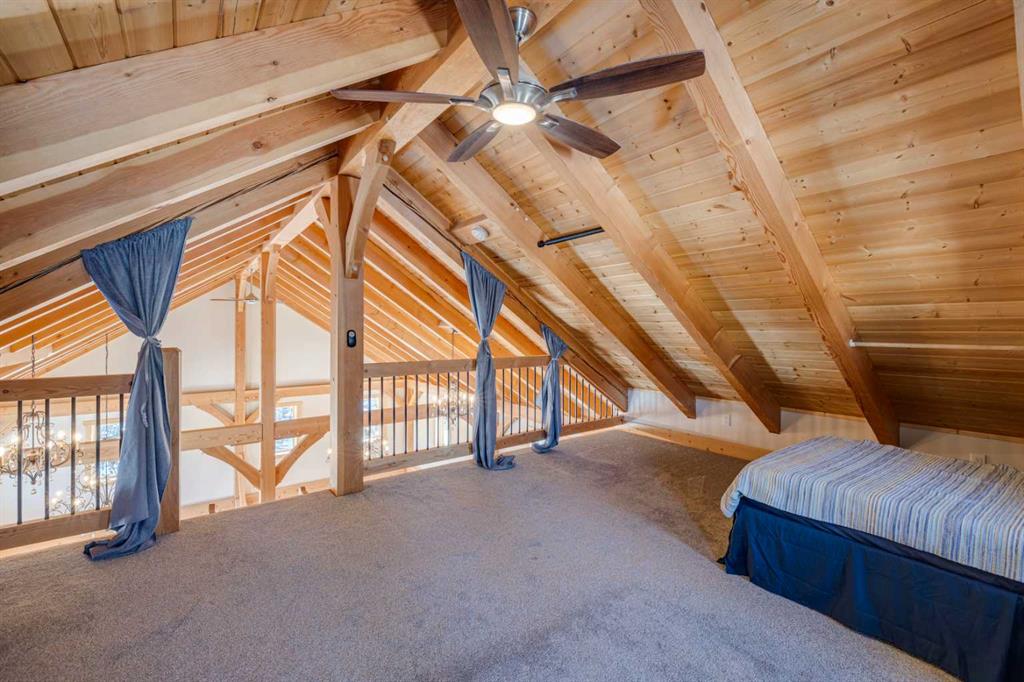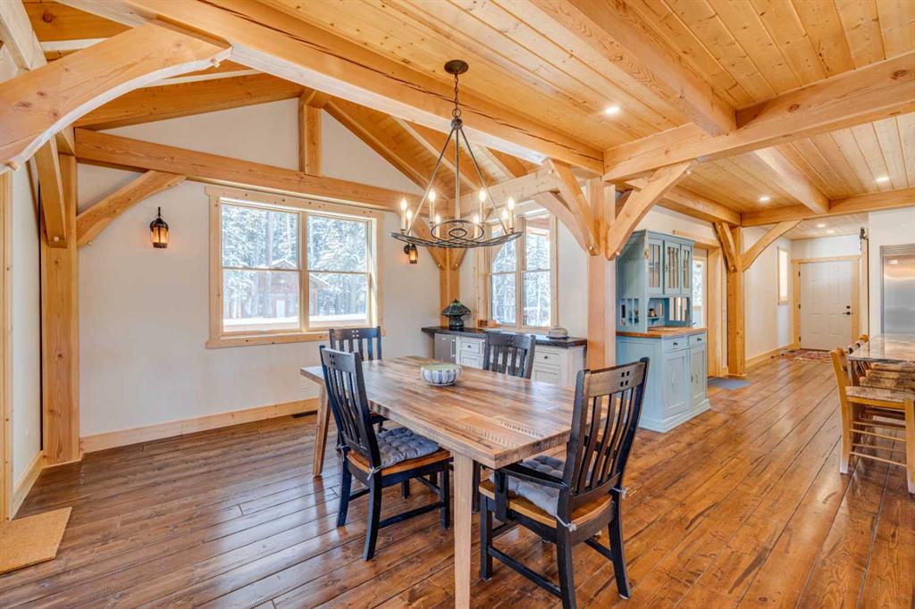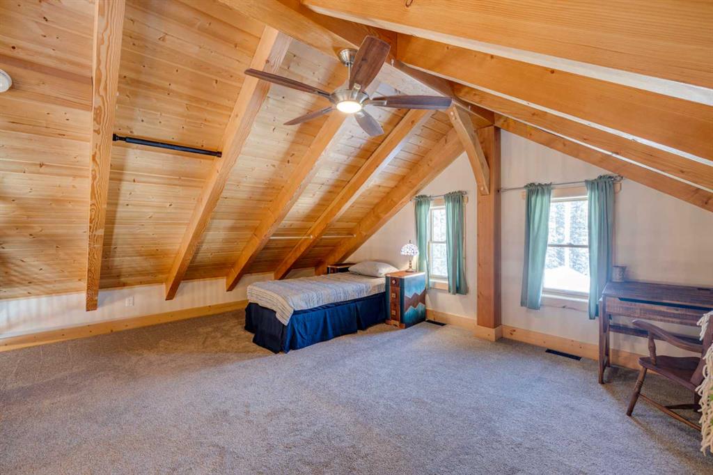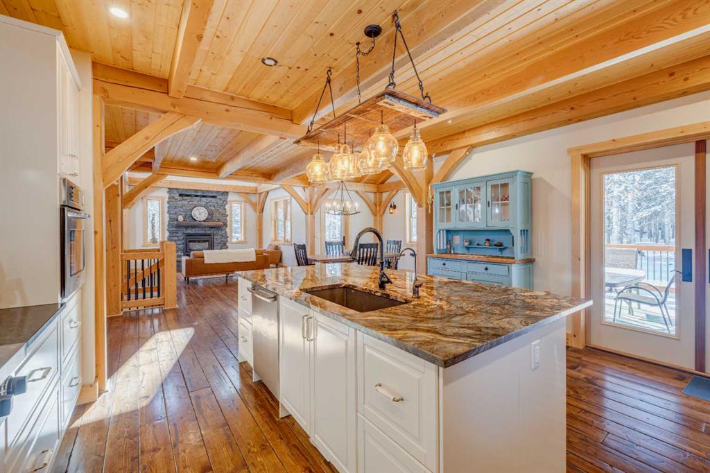 BRAGG CREEK TIMBER FRAME HOME ON 9.71 ACRES WITH CREEK & POND! This custom 2019 full structural timber frame home in West Bragg Creek offers over 4,000 sq ft of exceptional craftsmanship and a lifestyle immersed in nature. Set on a private acreage with a year-round creek, pond, and Trans Canada Trail access at the end of the driveway connecting you directly to world-class Kananaskis Country, this property is the ultimate retreat for outdoor enthusiasts and families seeking space, serenity, and adventure. Home Highlights: Hand-sculpted, pegged DOUGLAS FIR BEAMS AND COLUMNS, soaring vaulted ceilings, and walls of windows that frame panoramic views and flood the home with natural light. Custom pine hardwood flooring and an open-tread staircase carry the craftsmanship throughout every level. Open concept great room with stone wood-burning fireplace, perfect for cozy winter nights after skiing or snowshoeing. Chef’s kitchen with granite counters, central island, gas cooktop, and oversized side-by-side fridge/freezer designed for entertaining, holiday gatherings, and farm-to-table meals from your own greenhouse. Main floor bedroom/flex room provides ideal accommodations for guests, a home office, or multigenerational living, paired with laundry, mud room, and 2-piece bath for complete main-level functionality. Up the custom open-tread staircase, a very private primary retreat with luxurious 5-piece ensuite, jetted tub, tile shower, and double vanity, plus den/flex space as the perfect adult getaway. The loft overlooking the den and great room below delivers a magical, open-air feel that can be whatever you envision. Fully developed lower level with large family and games areas, three additional bright bedrooms, and flexible 2-piece and 3-piece bathrooms, ideal for movie nights, teens’ hangouts, or guest accommodations. In-floor heating on all 3 levels and garage. 12″ ICE foundation and roof (R60 insulating value) for exceptional efficiency and year-round comfort. Tankless hot water system. Wrap-around covered deck for year-round outdoor living, from summer barbecues to watching wildlife wander through the property. Property Features: 9.71 acres with creek, pond, and endless room to explore. Fully fenced and cross-fenced, ideal for horses and pets. Deluxe treehouse, firepit area, and miles of trails connecting directly to the natural beauty of Kananaskis Country via Trans Canada Trail at the end of the driveway. 200 sq ft powered GREENHOUSE with water supply supporting sustainable living and year-round growing. Abundant, high-quality well water and high-end septic mound system. Oversized heated double garage with 12′ ceilings and 60-amp sub-panel, ready for a workshop, EV charging, or all your recreational gear. Minutes to Bragg Creek amenities and world-class Kananaskis Country recreation, with three convenient highway routes to Calgary. A rare opportunity to own a modern timber frame home in one of Alberta’s most sought-after lifestyle communities.